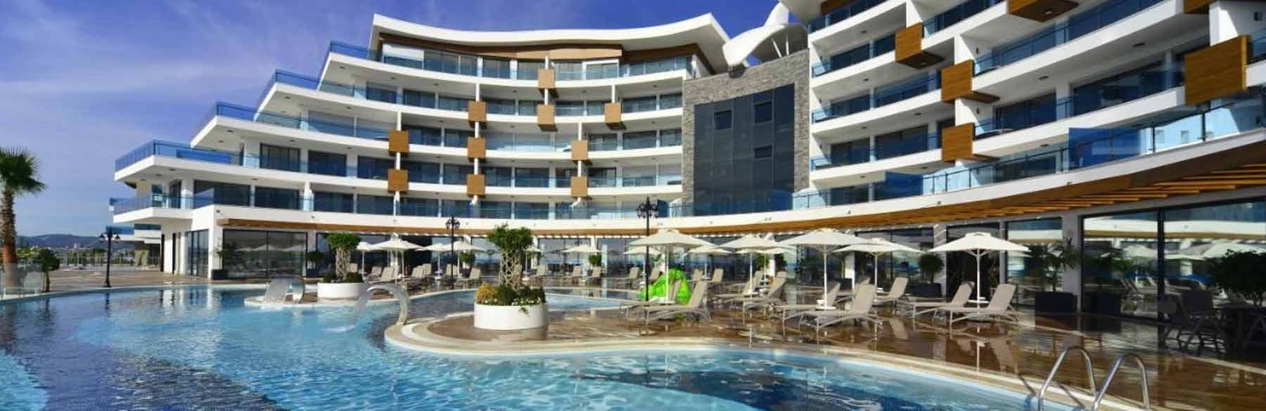 Set on a slope overlooking the Mediterranean Sea, this sophisticated hotel is 1 km from the nearest beach, 15 km from the 13th-century Alanya Castle and half a kilometer from Highway D400.